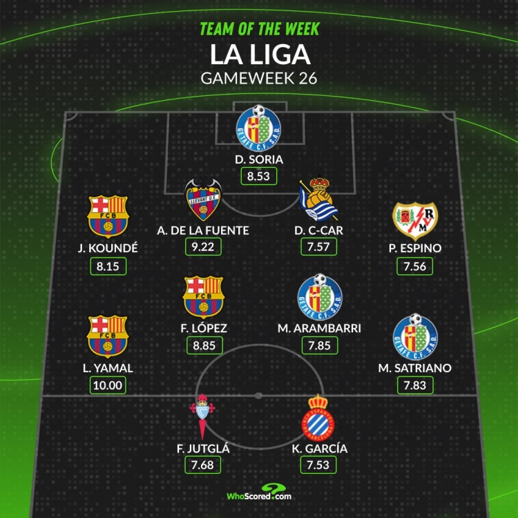 3月3日讯 西甲第26轮比赛战罢,WhoScored列出了本轮最佳阵容,亚马尔领衔。